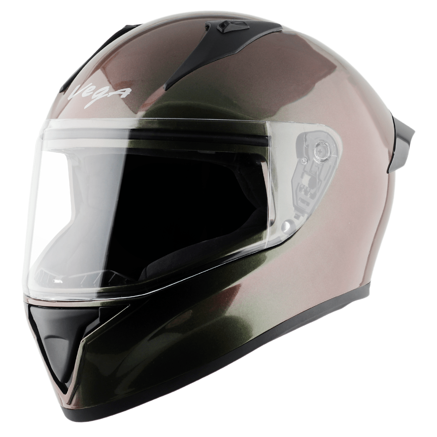 Presenting to you the VEGA BOLT helmet, with a new touch of dual-tone color and style. The helmet dances with light, shifting shades from Aqua Blue to Forest Green and Violet as the sun moves across the sky, and at night the dual tone reflects your bold rider spirit. This crown shines just like your rider personality.